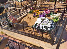 Когда памятник был изготовлен, идём на место захоронения. На данный момент на могиле находится лишь холмик, на котором растут цветы.