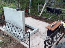Следующим этапом в работе с могилой стала установка нового памятника, выполненного из светлого гранита и рассчитанного на двух покойных. Плиту доставили на кладбище практически сразу после изготовления, так что надпись пришлось делать уже по месту. Впрочем, на качестве работы это не коим образом не отразилось.